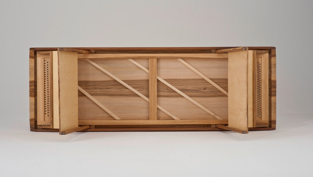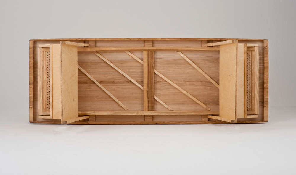 Der bei der Klangliege Intens beschriebene Korpus (Liegefläche) ruht hier auf einem stabilen, zusammenfaltbaren Gestell. Liegefläche, Gestell und Korpus- rahmen sind aus massiver Esche, die Liegefläche kann jedoch aus Klanggründen auch gerne aus Resonanzfichte gefertigt werden.