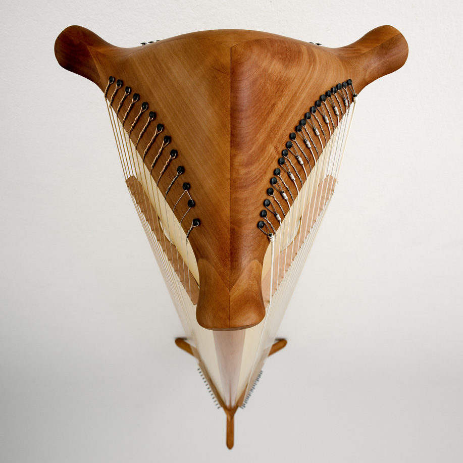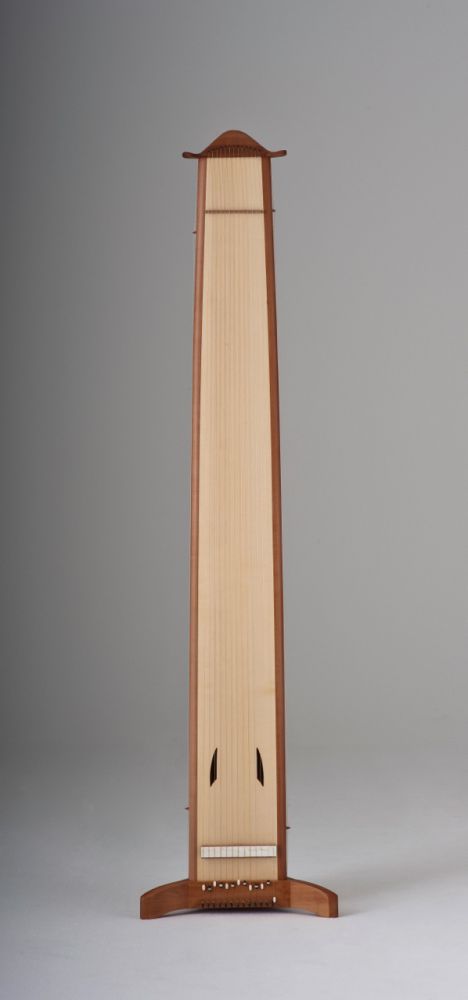 Dieses Instrument erhielt seine Form durch meinen Wunsch, unterschiedliche, durch Saitenklang erzeugte Ober- und Untertonphänomene zusammen zu bringen. Entstanden ist ein optisch sehr ansprechender, fein gearbeiteter, dreiflächiger Obelisk, der auf seinen drei, bzw. insgesamt sechs Füßchen senk- recht stehend oder liegend gespielt werden kann.
